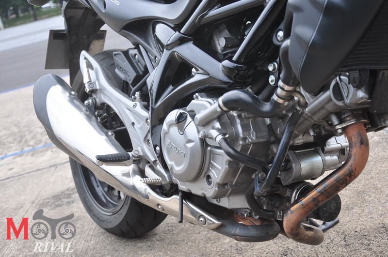 ช่วยออกตัวในเกียร์ 1 ทอร์คมาหนักตามสไตล์รถ 2 สูบ Middle Weight อย่างตระกูล ER6 (แต่ไม่หนักหน่วงเท่า MT-07 ซึ่งเราอาจจะขอไม่เทียบกับ MT-07 โดยตรงนักเพราะถือว่าเป็นรถที่ Oversized 689cc) จุดที่น่าประทับใจกว่าคู่แข่งค่ายเขียวอย่างชัดเจน คือที่รอบต่ำเกียร์ 2 ซึ่งมักพบอาการสำลักของเครื่องยนต์นั้น คุณจะไม่พบอาการน่ารำคาญเหล่านั้นในเครื่อง V-Twin ของ Suzuki จนกว่าคุณจะใช้เกียร์ 3 ในการออกเคลื่อนตัวที่ความเร็วต่ำๆ ก็จะมีมาให้เห็นบ้างแล้ว นอกจากนั้นจุดที่น่าประทับใจของเครื่องบล๊อก V นี้ คือ คันเร่งที่สมูท เดินเรียบเนียน ทอร์คที่ถูกถ่ายทอดออกมาอย่างสม่ำเสมอ เครื่องยนต์ของ Gladius จะเริ่มเข้า Redline @10,500rpm ขณะที่ V-Strom จะอยู่ที่ 10,000rpm