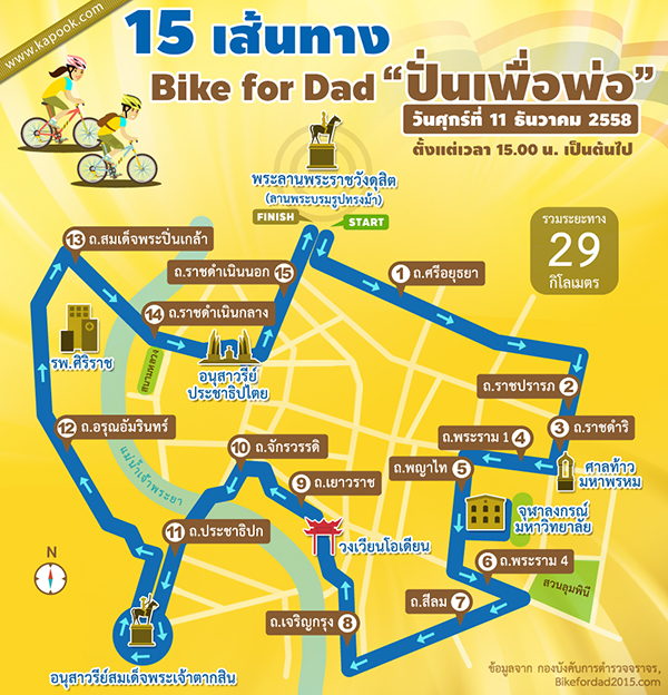 สรุปถนนที่ใช้ในกิจกรรม Bike for dad ปั่นเพื่อพ่อ 15 เส้นทาง ดังนี้