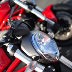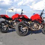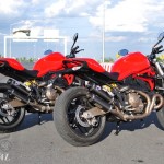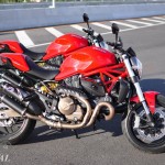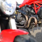 เริ่มตั้งแต่บิดกุญแจสตาร์ทเครื่องยนต์ เสียงกระหึ่มสุดดังจากชุดท่อ Termignoni แม้ว่าใส่ Silencer แล้วก็ตาม มันยังคงดังเอาเรื่อง หากแผดเครื่องยนต์ไปที่รอบสูง แต่รอบเดินเบานั้นจะเงียบกว่าการถอด Silencer อยู่พอสมควร แต่ในด้านของซุ้มเสียงนั้น จากรูปแบบ 2 วาล์ว เป็น 4 วาล์วนั้น ผู้เขียนมีความเห็นว่า เอกลักษณ์ความดิบในแบบ M795, M796 นั้นเปลี่ยนไป เสียงของ M821 จะดูสุขุมนุ่มลึกมากขึ้น และรอบเดินเบาจะรู้สึกเดินนิ่งเรียบขึ้นด้วย