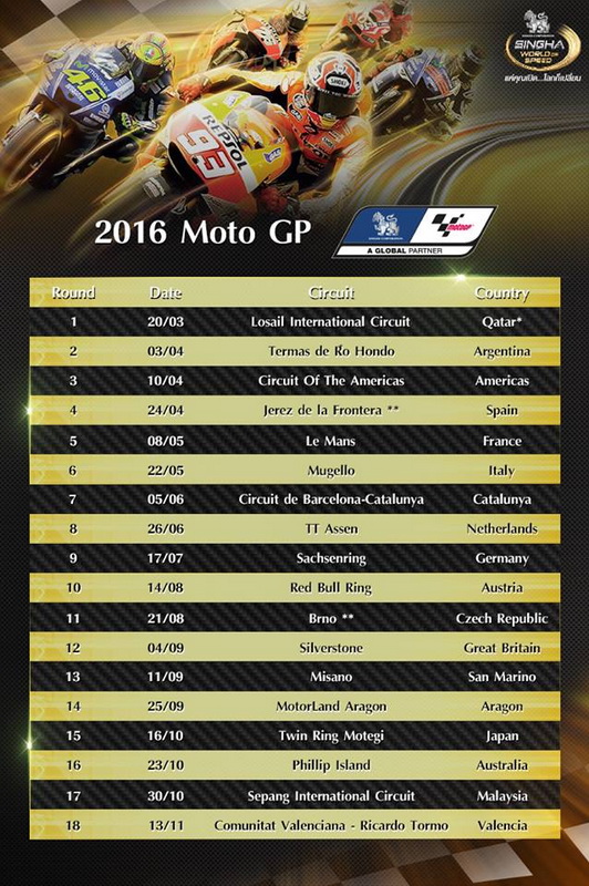 แม้ว่าเราจะเคยยืนยันตารางการแข่งขัน 2016 MotoGP ไปแล้วในเดือน พย. มาวันนี้เราขออัพเดทตาราง 2016 MotoGP อีกครั้ง ซึ่งทาง สิงห์ (Singha) ผู้เป็น Partner ร่วมในรายการนี้ได้เผยตารางการแข่งขัน มาเมื่อวันก่อนผ่านทางเพจ Singha Motor Sport โดยมีตารางการแข่งขันดังนี้