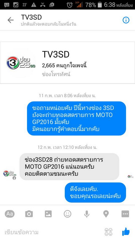 นอกจากนี้ยังมีผู้ใช้ FB ชื่อ คุณ Oho Lippo ได้โพสต์ภาพการสอบถามเรื่องการถ่ายทอดสดไปยังช่อง 3SD ซึ่งได้รับการยืนยันมาว่า ช่อง 3SD จะยังถ่ายทอดสด 2016 MotoGP ให้เราได้รับชมกันต่อแน่นอนในปีนี้