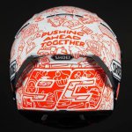 นอกจากนี้ยังมีการเขียนตัวอักษร “Pushing Ahead Together” ที่แปลว่า “ก้าวไปข้างหน้าด้วยกัน” ไว้ด้านท้ายหมวกด้วย แต่จะมีความแตกต่างระหว่างหมวกทั้งสองใบอีกเล็กน้อยนั่นก็คือโทนสี ที่จะเปลี่ยนตามสีประจำตัวของนักบิดทั้งสองพี่น้อง นั่นก็คือในฝั่ง Marc Marquez จะเป็นหมวกสีส้มแดง และของ Alex Marquez จะเป็นหมวกสีฟ้า