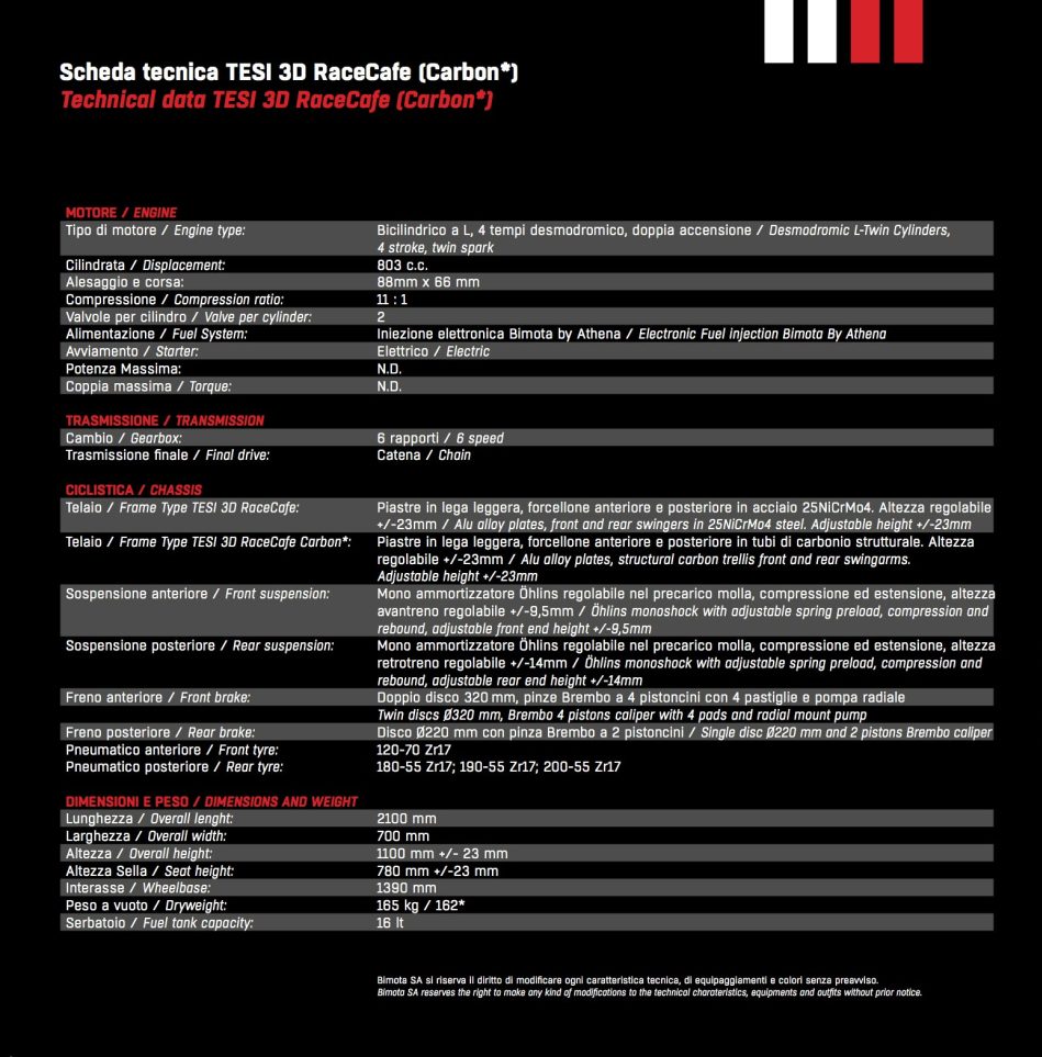 Bimota Tesi 3D RaceCafe มีน้ำหนักตัวที่ 165 กก. มีความสูงเบาะ 780 มม. +- 23 มม.