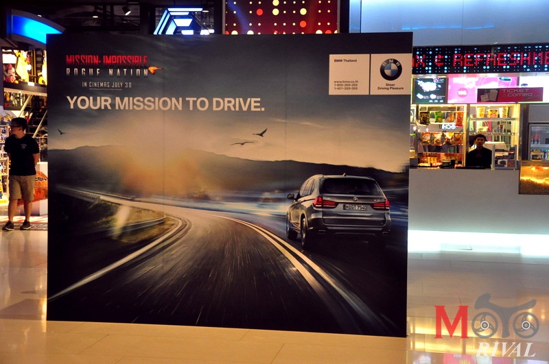 BMW Group ประเทศไทย จัดกิจกรรม เชิญสื่อและลูกค้าชม ชมภาพยนตร์ฟอร์มยักษ์รอบพิเศษ Mission Impossible 5: Rogue Nation (MI5) ซึ่งในภาพยนตร์ได้ใช้รถยนต์ BMW M3 และมอเตอร์ไซค์ BMW S 1000RR ในคิวบู๊สุดมันส์ของเรื่องซึ่งการชมภาพยนตร์ในรอบพิเศษนี้จัดขึ้นที่ โรงภาพยนตร์ SF World Cinema เมื่อวันที่ 29 กค. ที่ผ่านมา