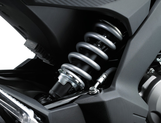 -โช้คอัพหลังปรับพรีโหลดได้ถึง 4 ระดับเพื่อให้ผู้ขับขี่ได้ปรับความเหมาะสมกับน้ำหนักตนเองและเมื่อมีผู้โดยสารการวางโช้คหลังที่เป็นเอกลักษณ์และเสริมความคอมแพคกับโครงสร้างให้การขับขี่แบบสปอร์ต เบา คล่องตัว