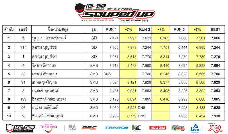 หากใครก็ตามที่ได้ติดตามรับชมการจัดอันดับ ECU Shop Top Ten Dragster Souped Up Thailand Records 2015 ทั้งในสนามคลองห้า และบุรีรัมย์ เกิน 1 แสน 5 หมื่น คน และรับชมผ่านเวบไซต์ อีกว่า 2 แสนคน คงได้เป็นพยายานกับปรากฎการณ์งานแดร็กที่ยิ่งใหญ่ที่สุดในประเทศ และที่สำคัญคือสถิติตัวเลข 6 วินาที ที่งานนี้ได้จารึกขึ้น แต่ทว่านี่คือจุดเริ่มต้นของความยิ่งใหญ่ ที่คนไทยอย่างพวกเราจะพัฒนาต่อไป ในวันข้างหน้าอันใกล้ เราอาจจะมีโอกาสได้ชมปรากฏการณ์หน้าใหม่ของตัวเลข 5 วินาทีก็เป็นได้ แล้วพบกันในศึกแห่งศักดิ์ศรี ECU Shop Top Ten Dragster Souped Up Thailand Records 2016