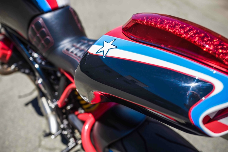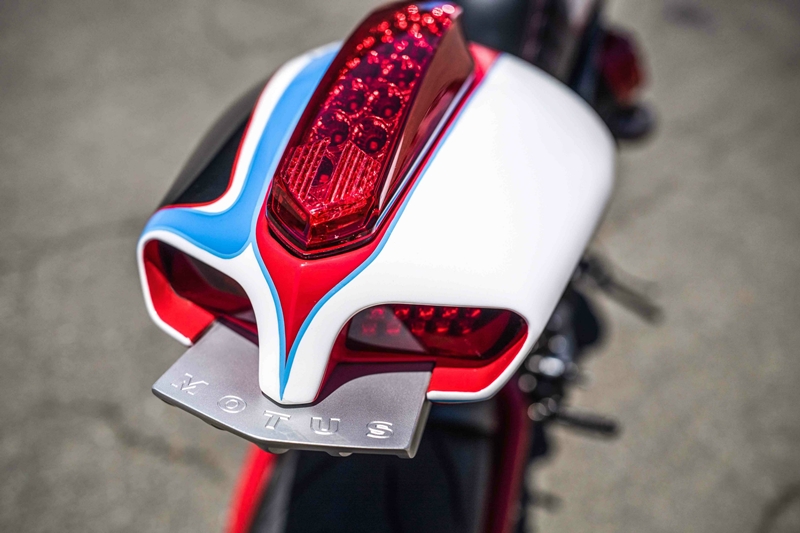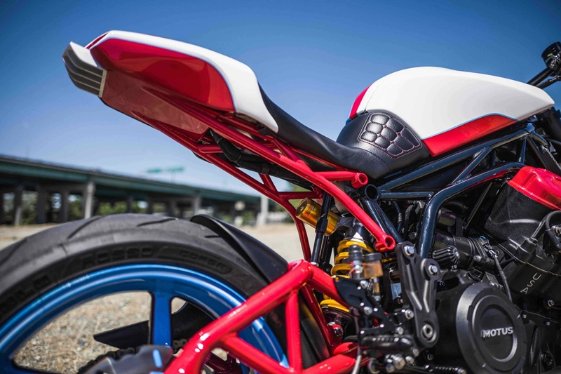 ซับเฟรมหลังออกแบบใหม่ใช้วัสดุเหล็กโครโมลี่ พร้อมติดตั้งฐานรองเบาะอลูมิเนียม และวางทับอีกชั้นด้วยโฟมกับแผ่นหนังจาก Cato’s Custom Upholstery ครอบท้ายตีขึ้นรูปจากอลูมิเนียมรหัส 3003-H14 เสริมความดุดันด้วยไฟท้าย LED จาก Victory Octane และแผ่นดิฟฟิวเซอร์งาน CNC แกะตัวอักษร “M O T U S”