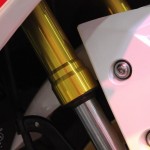 ระบบกันสะเทือน โช้กหน้าแบบ UpSideDown จาก KYB แกนสีทอง ก็ถูกยกมาจาก Demon 150 GN เช่นกัน