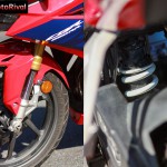 อย่างไรก็ดี ด้วยการเซ็ทติ้งโช้กแบบสปอร์ตเรพลิก้า ดังนั้นความสามารถในเรื่องของการซับแรงจากผิวถนนที่ขรุขระจึงอาจทำได้ไม่ดีเท่าไหร่นัก ค่อนไปทางกระทั้นนิดๆ แต่เมื่อขี่รถด้วยความเร็วสูงๆทั้งในทางตรงและทางโค้ง อาการของรถกลับค่อนไปทางยืดหยุ่นอย่างมั่นคง แทบไม่มีอาการดิ้น เว้นแต่ผิวถนนจะไม่เรียบหรือลื่นจริงๆ เรียกได้ว่าเป็นระบบกันสะเทือนติดรถที่ให้ความมั่นใจกับผู้ขี่เป็นอันดับต้นๆของคลาส หรือแทบจะเทียบเท่ากับพี่รองอย่าง CBR600RR เลยทีเดียว