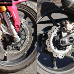 ในส่วนของระบบเบรก อาจจะน่าเสียดายไปนิด ที่มันยังคงเป็นแบบโฟลทติ้งเมาท์ 2 พอร์ท แต่หากพูดถึงประสิทธิภาพ มันกลับเป็นระบบเบรกที่ให้ความอุ่นใจกับผู้ขี่ได้เป็นอย่างดี เพราะผู้ขี่ใช้ระยะในการกดก้านเบรกลงไปเพียงเล็กน้อย เบรกก็พร้อมจะทำงานและหยุดชะลอรถอย่างหนักหน่วงทันที ติดแค่เพียงในระยะกดแรกๆอาจจะตึงมือไปสักนิดเท่านั้น ทว่าตัวเบรกหลังนั้นค่อนข้างนุ่มนวล ไม่ติดใจใดๆทั้งสิ้นในส่วนของน้ำหนักการกด