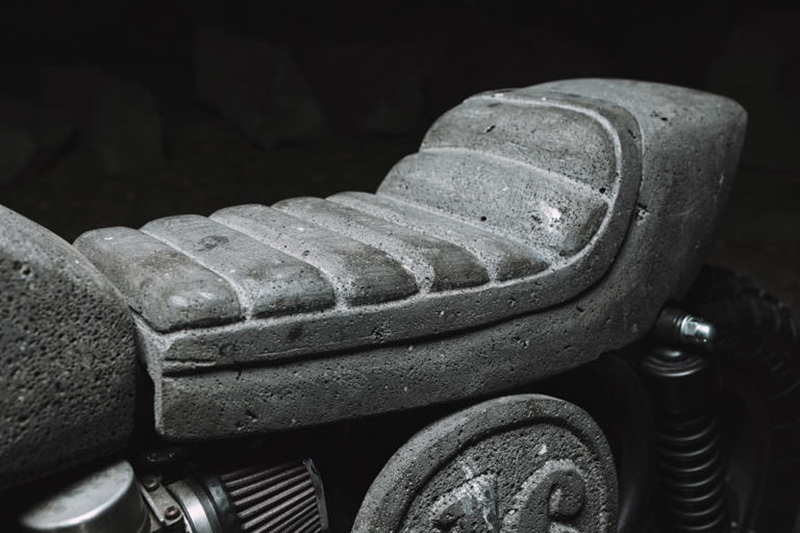 แล้วเปลี่ยนเอากรอบไฟหน้า ถังน้ำมัน เบาะนั่ง และเพลทตัวเลขด้านข้าง ที่ทำจากหินลาวา-บะซอลต์ หนัก 450 กิโลกรัม แกะสลักใหม่จนเหลือ 60 กิโลกรัม เสริมแกร่งด้วยโครงรถทำจากเหล็กหนา 4 มิลลิเมตร เพื่อรองรับน้ำหนักตัวรถที่เพิ่มขึ้น