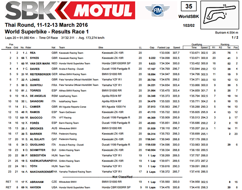 การแข่งขัน 2016 WSBK Race 1 ณ สนามช้างฯ เซอร์กิต จบลงแล้วในวันนี้ 2 นักบิด Kawasaki Racing Team (KRT) เหมาอันดับ 1-2 โดยแชมป์เก่าปีที่แล้ว Rea ยังฟอร์มดีรักษาแชมป์ไว้ได้เช่นเคย
