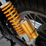 ระบบกันสะเทือน โช้คหน้า Telescopic แกนโช้คขนาด 41 มม. มีระยะเคลื่อนตัว 110 มม. โช้คอัพหลังคู่ Paioli พร้อมซับแท้งค์แยก ปรับ Preload ได้ มีระยะเคลื่อนตัว 80 มม.