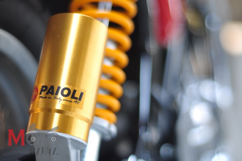 ระบบกันสะเทือน โช้คหน้า Telescopic แกนโช้คขนาด 41 มม. มีระยะเคลื่อนตัว 110 มม. โช้คอัพหลังคู่ Paioli พร้อมซับแท้งค์แยก ปรับ Preload ได้ มีระยะเคลื่อนตัว 80 มม.