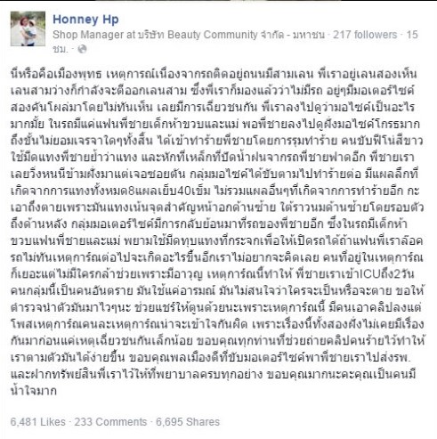ซึ่งเหตุการณ์นั้น เกิดขึ้นเนื่องจาก ผู้ขับกระบะเฉี่ยวชนกลุ่มนักศึกษา จนรถจักรยานยนต์ล้ม และเพื่อนหญิงที่นั่งมาด้วยกำลังตั้งครรภ์ จึงโมโห และบรรดาลโทสะ ด้วยการเข้ารุมทำร้ายและเอามีดที่พกมาแพงใส่ จนผู้ขับกระบะบาดเจ็บสาหัส แต่ ณ ขณะนี้อาการดีขึ้นแล้ว