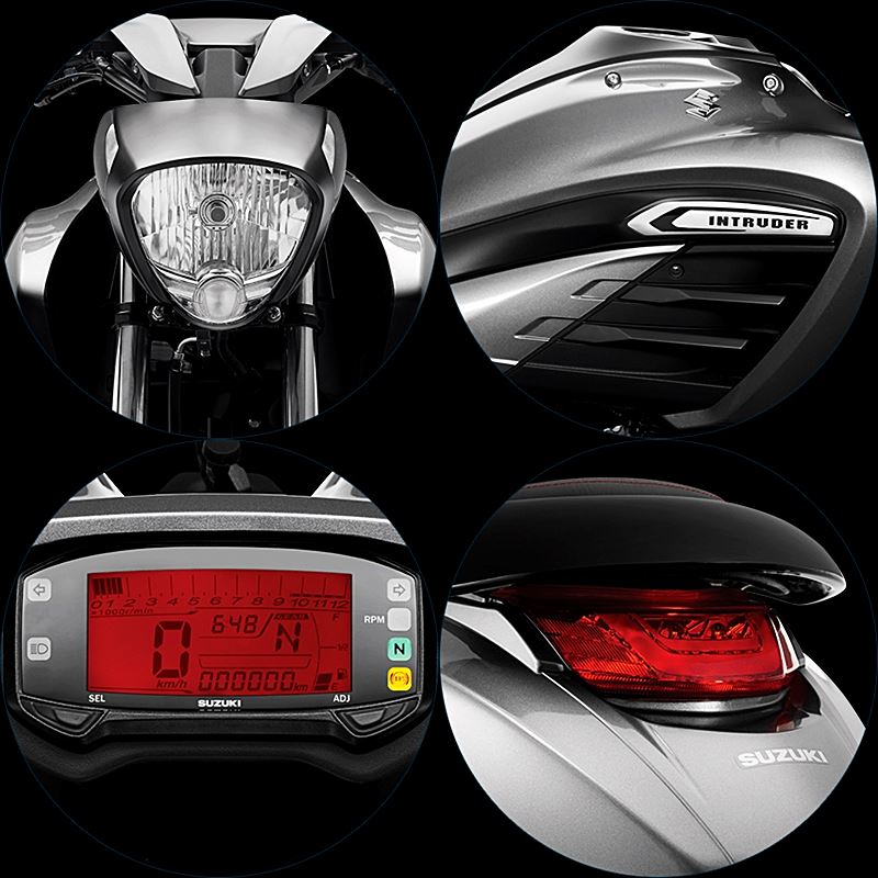 สำหรับการตกแต่งภายนอกตัวรถ Suzuki Intruder 150 นอกจากชุดแฟริ่งที่มีดีไซน์สปอร์ต เฉียบคม แต่ก็แฝงไปด้วยความอวบอัดตามสไตล์รถมอเตอร์ไซค์แนวครุยเซอร์แล้ว ชุดไฟหน้าและไฟท้ายก็ยังเป็นแบบ LED ทั้งหมด, หน้าจอแสดงผลแบบ Full Digital ให้ข้อมูลครบทุกอย่างทั้งวัดรอบ ความเร็ว ตำแหน่งเกียร์ ระดับน้ำมัน ระดับอุณหภูมิเครื่องยนต์ และระยะทาง, ชุดล้อเป็นแบบ 3 ก้านตัว Y ขนาด 17 นิ้วรัดด้วยยางขนาด 100/80 ที่ล้อหน้า และ 140/60 ที่ล้อหลัง ส่วนระบบเบรกเองก็ติดตั้งระบบ ABS มาให้เป็นที่เรียบร้อย, ปิดท้ายด้วยปลายท่อไอเสียแบบคู่ดีไซน์โฉบเฉี่ยวซึ่งดูเข้ากันดีกับเส้นสายของตัวถังรอบคัน