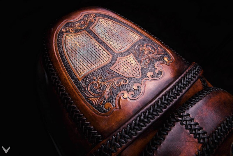 ในส่วนของเบาะนั่งและปลอกแฮนด์ถูกหุ้มใหม่ โดยใช้หนังที่ตัดเย็บลวดลายพิเศษ โดยจะมีจุดเด่นคือการพิมพ์ลายกะโหลกวัว และสัญลักษณ์ตัว “V” อันเป็นสัญลักษณ์ประจำสำนัก โดยใช้สีที่ใช้ฟอกนั้นเป็นสีที่ผลิตขึ้นจากผัก เพื่อให้ได้สีที่ดูเป็นธรรมชาติมากที่สุด และแน่นอนว่ามันเป็นงานที่ทำขึ้นด้วยมือ