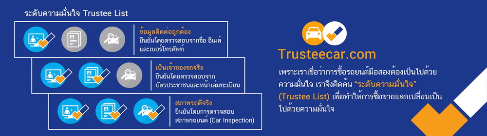 นอกจากนั้นบนเว็บไซต์ของ Trusteecar.com ยังมีไฮไลท์ที่เว็บไซต์อื่นไม่มี นั้นก็คือ เครื่องหมาย Trustee List ที่เป็นเหมือนคะแนนที่สามารถสร้างความมั่นใจให้กับผู้คนที่เข้าชมเว็บไซต์หรือผู้ที่จะซื้อรถมือสอง เป็นระดับวัดความมั่นใจ โดยเป็นระบบแสดงการตรวจสอบข้อมูลรถมือสองของผู้ขายหรือดีลเลอร์นั้นๆ ซึ่งจะบอกรายละเอียดของรถมือสองดังนี้