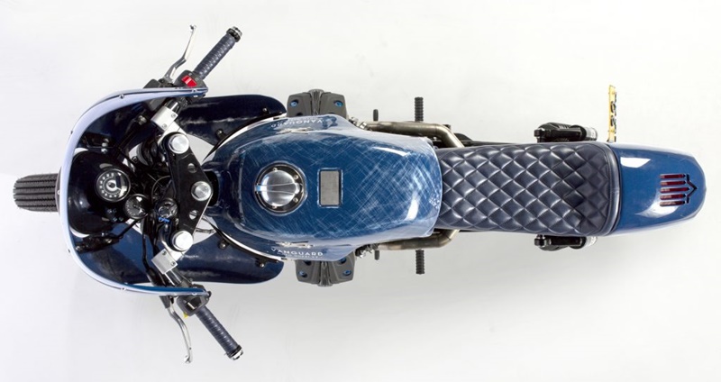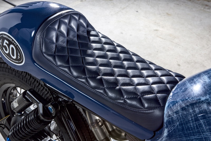 ส่วนการตกแต่งอื่นๆก็ถูกดีไซน์มาเพื่อให้สมกับแนวตัวแข่งยุคปี 70 แทบทั้งหมด ไม่ว่าจะเป็นแฮนด์หมอบ, พักเท้ายกสูง, ล้อซี่แต่งลายสกรีนคำว่า “Vanguard”, ท่อไอเสียแบบ 2-1 เดินออกใต้เบาะผู้ขับ, และโช้กแก๊สหลังจาก YSS (แบรนด์คนไทยเรานี่แหล่ะครับ) แล้วปิดงานด้วยการไล่น็อตจุดสำคัญๆให้เป็นสีน้ำเงินทั้งหมด