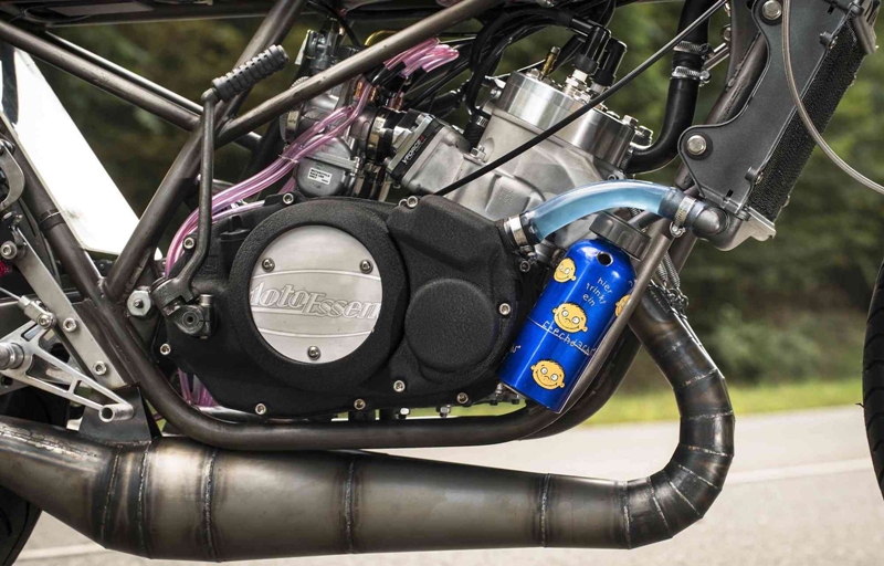 กลับมาที่ Yamaha RD350 คันนี้อีกครั้ง มันได้รับการขยายความจุเครื่องยนต์จากเดิม 347cc เป็น 420cc ลูกสูบคุณภาพสูงจาก Wiseco เปลี่ยนคาร์บูเรเตอร์ลูกใหม่จาก Keihin พร้อมปรับปรุงระบบท่อไอเสียและระบบคลัชท์ใหม่ เพื่อให้รองรับกับพละกำลังสูงสุดที่พุ่งไปถึง 90 แรงม้าด้วยกัน